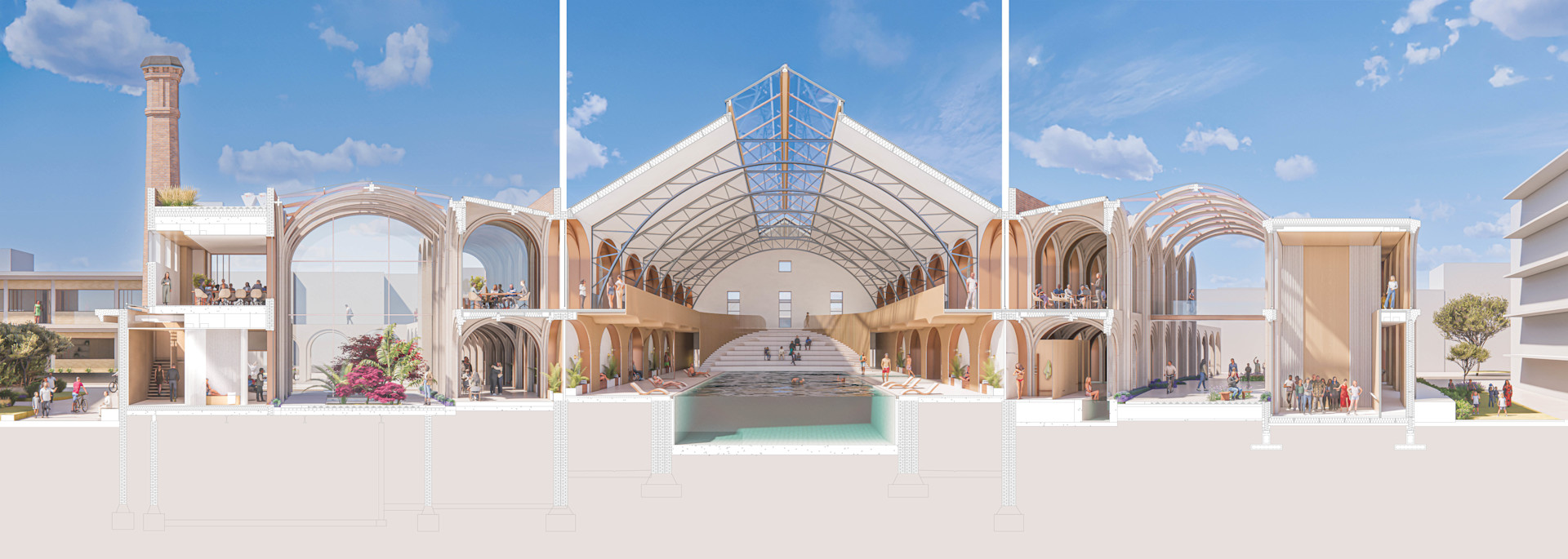 Arts, clinical, hydrotherapy and coworking adaptive re-use development, with porous architectural boundaries to maximise social interaction between diverse user groups and nurture a shared ευtopian prosperity.