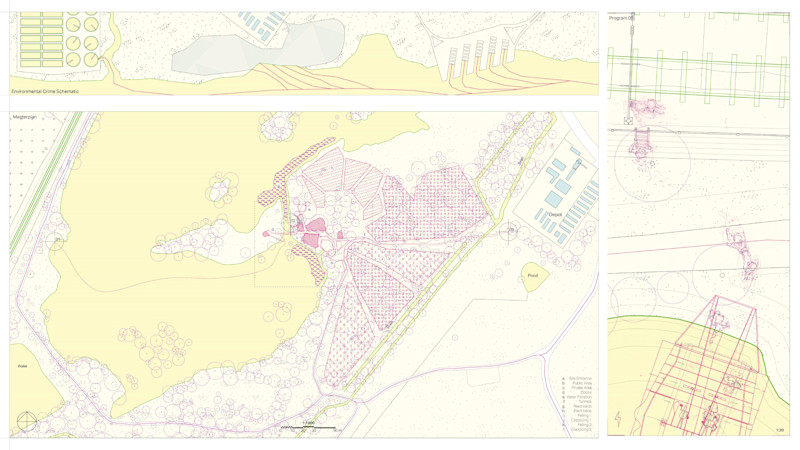 The project imagines a raised walkway that navigates protestors and locals alike through the forest where they hide. The form is dictated by the location of the existing trees and the contours of the land.