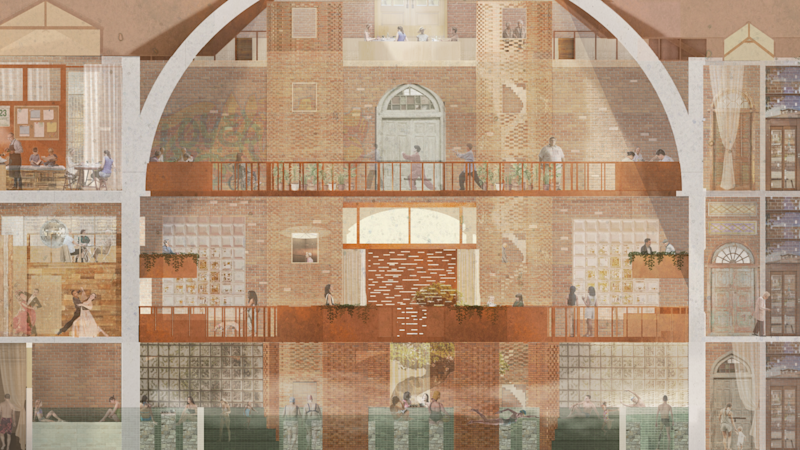 The project proposes a mixed-use program, integrating a public laundrette, communal residential units, a shared eatery, and slipper bath spaces along the perimeter, whilst preserving the central atrium’s original bath and pool as the main public space. The project also seeks to expand the adjacent community centre, enabling greater participation in outreach activities.